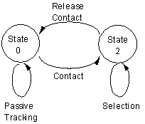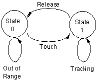 In this case we also get two states, but only one is common to the previous example. This is illustrated in Fig. 2. The first state, (State 0), is what we will call out of range, (OOR). In this state, any movement of the finger has no effect on the system. It is only when the finger comes in contact with the tablet that we enter the State 1, the tracking state seen in the previous example.