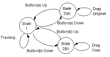The three states introduced in the above examples are the basic elements of the model. There can be some variations. For example, with a multi-button mouse (or the use of multiple clicks), State 2 becomes a set of states, indexed by button number, as illustrated in Fig. 4.